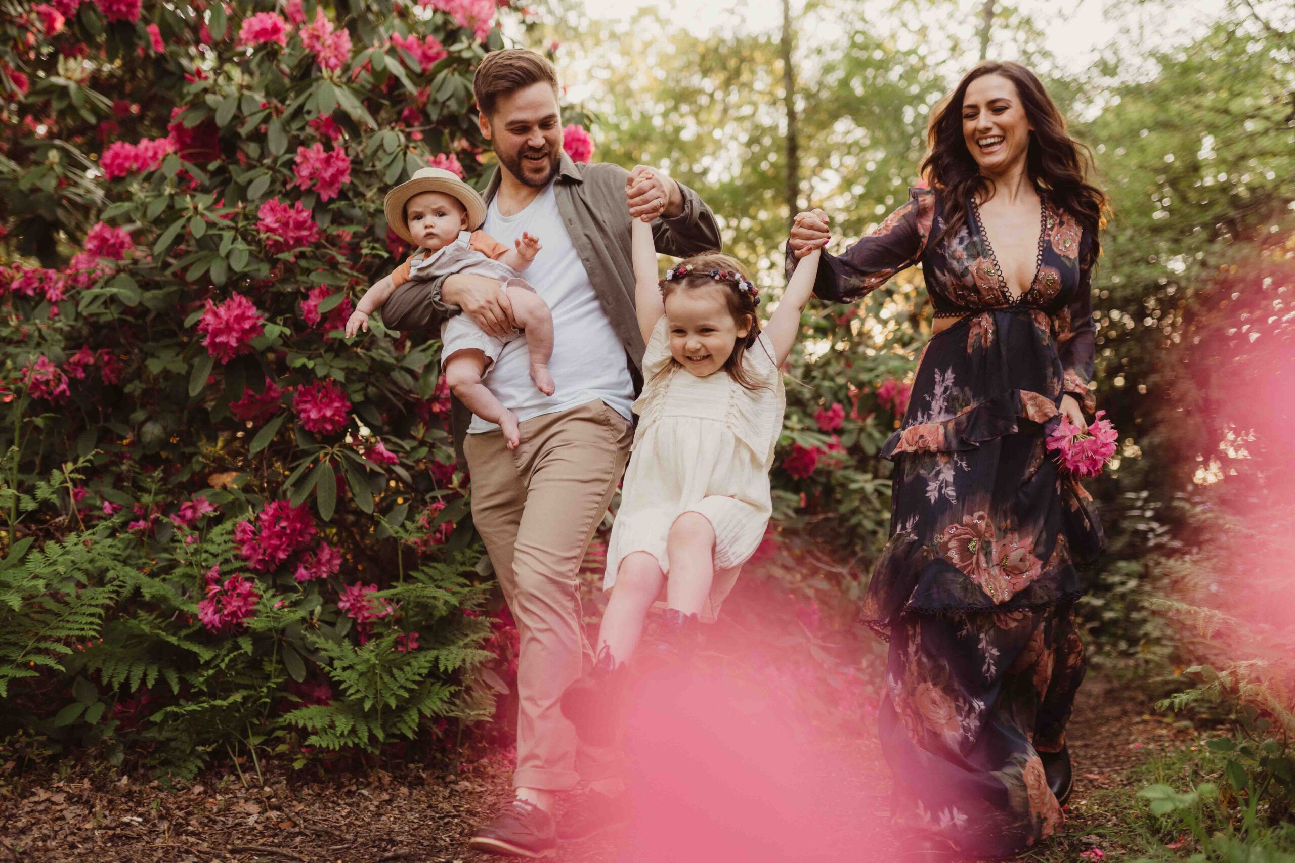 Rhododendrons bloom everywhere in the Bracknell Forest. The location I use is buggy accessible and has easy access from the car park. This makes it great for grandparents to be involved and for older babies upwards. The slower pace can suit certain families who have quieter children or older babies or teens. Unlike blossoms, Rhodondendrons are the ‘hard nuts’ of flowers and can withstand bad weather and rain storms intact. Their bloom window is quite long and reliable. It lasts from around the 20th May to the first few days of June. The amount of colour on show is amazing in during these photoshoots! If you love a colourful floral show then these are for you.