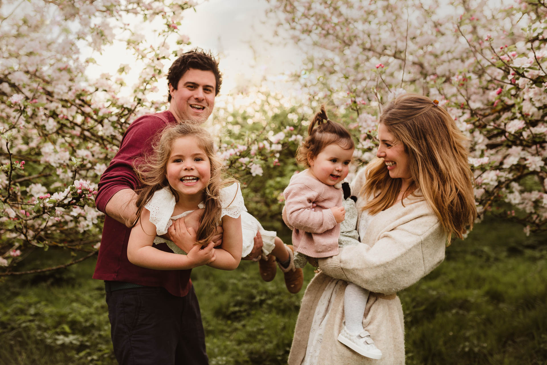 Book onto one during mid April. I’ll keep you in the loop regarding the bloom times and handle the weather watching for you. As long as you are flexible for change and happy with a ‘back up bloom’ should mother nature be in a mood… blossoms are a gorgeous option for a spring family photoshoot. See the photos below from cloudy and sunny parts of the session and the variety the adjacent field provides.