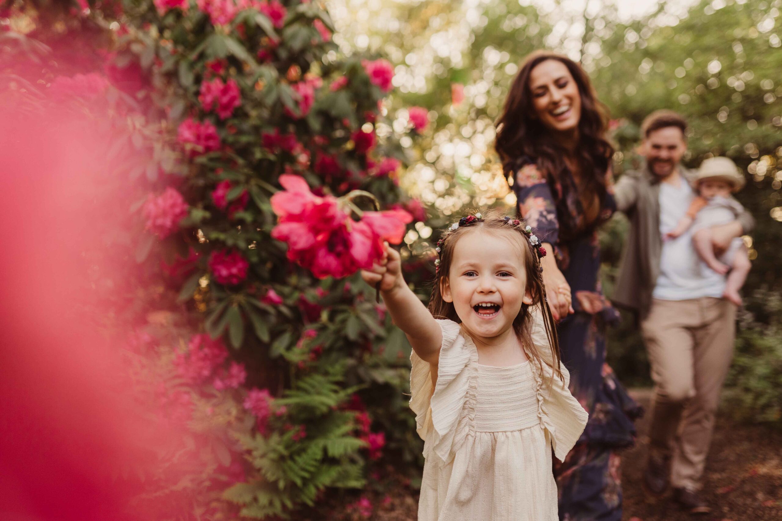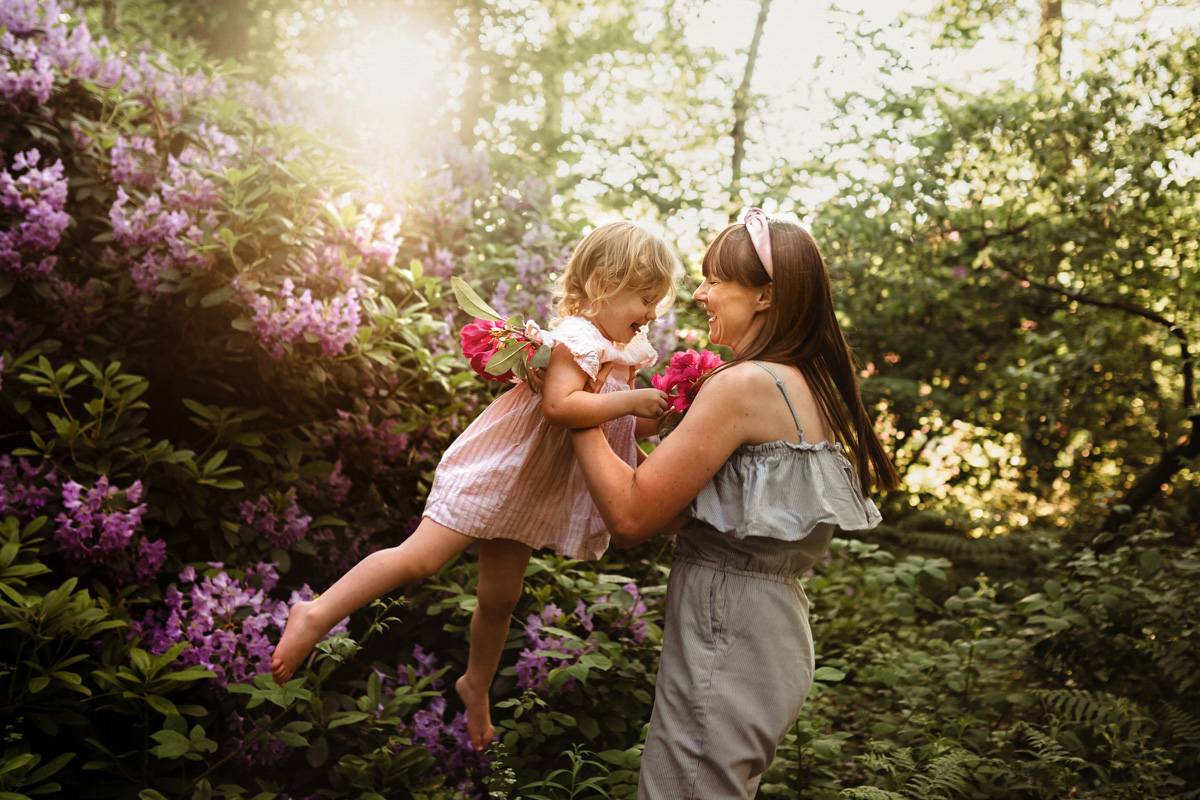 Rhododendrons bloom everywhere in the Bracknell Forest. The location I use is buggy accessible and has easy access from the car park. This makes it great for grandparents to be involved and for older babies upwards. The slower pace can suit certain families who have quieter children or older babies or teens. Unlike blossoms, Rhodondendrons are the ‘hard nuts’ of flowers and can withstand bad weather and rain storms intact. Their bloom window is quite long and reliable. It lasts from around the 20th May to the first few days of June. The amount of colour on show is amazing in during these photoshoots! If you love a colourful floral show then these are for you.